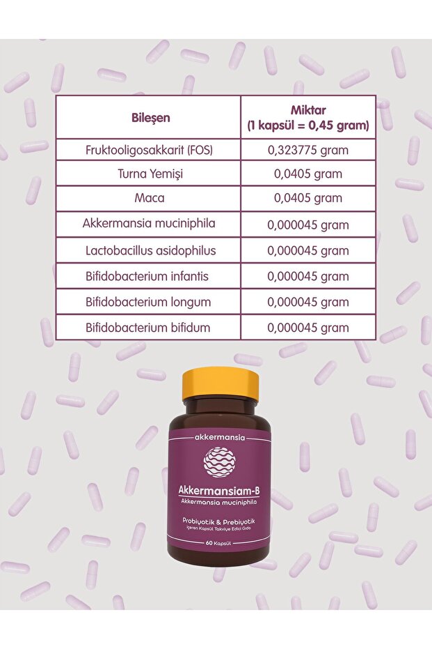 Akkermansiam-B 60 Kapsül Akkermansia muciniphila İçeren Kapsül Takviye Edici Gıda 60 Kapsül İçindekiler: Frukto Oligosakkarit (FOS), Turna Yemişi (Cranberry), Keçiboynuzu Tozu, Probiyotik mikroorganizma