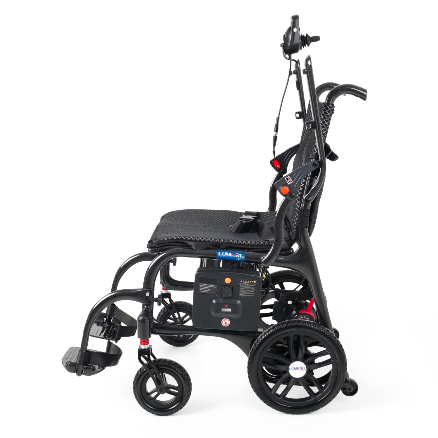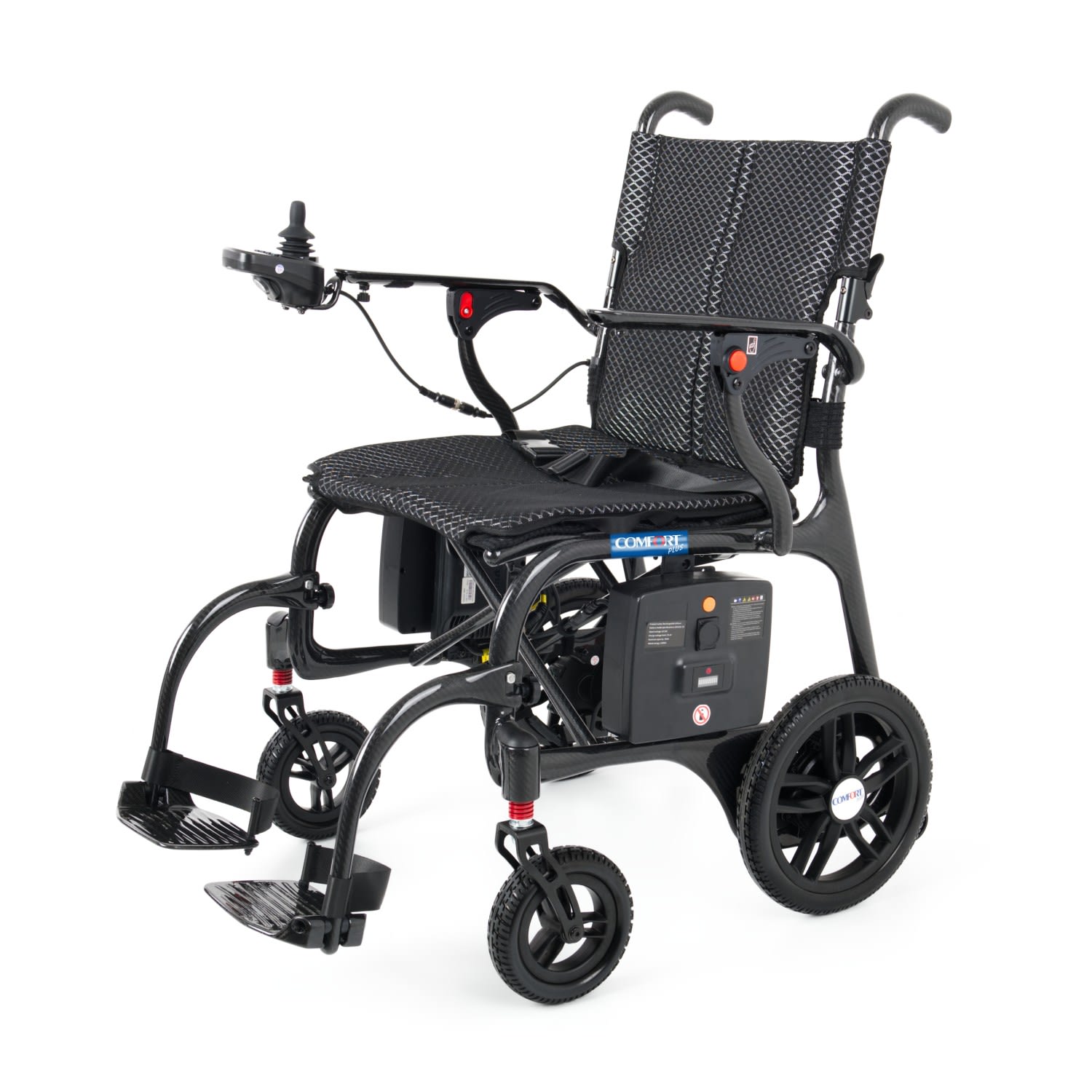 Comfort Plus DY01107 Karbon Lityum Pilli Akülü Tekerlekli Sandalye – Ultra hafif karbon fiber gövdesi ile güç, dayanıklılık ve konforu bir arada sunar. Katlanabilir tasarımı, uzun ömürlü lityum pil teknolojisi ve joystick kontrollü sürüş sistemiyle şehir içi ve seyahat kullanımına mükemmel uyum sağlar. Hafif, sağlam ve taşınabilir yapısıyla günlük hayatınızı kolaylaştırır.