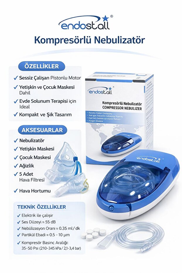 ENDOSTALL Kompresörlü Nebulizatör – Yetişkin & Çocuk Maskeli Buhar Makinesi